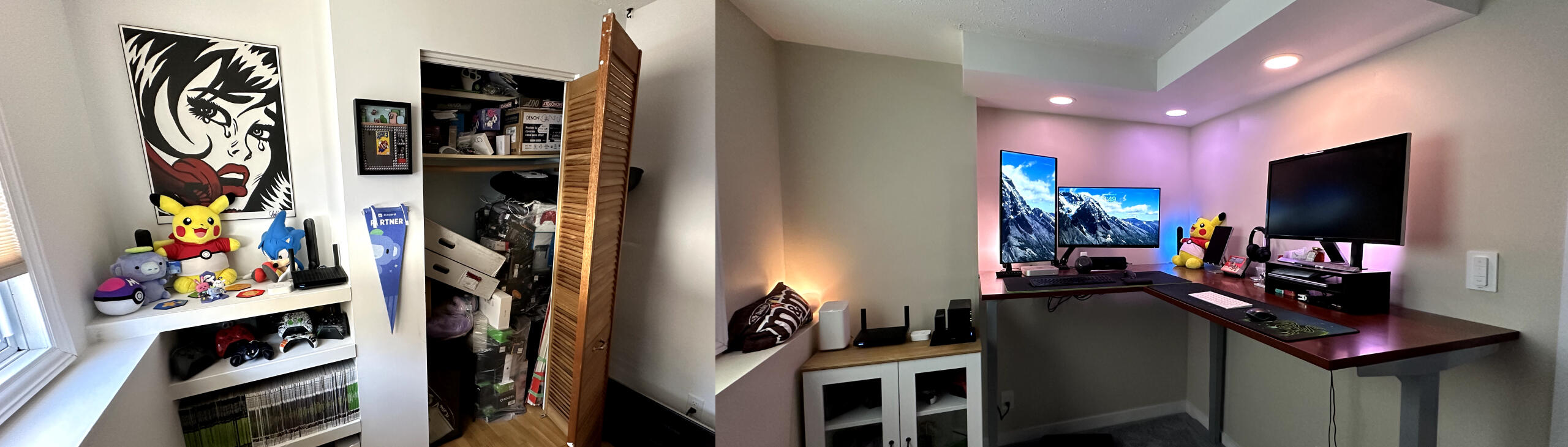 I've been using this lower level room as my home office since moving into the house a couple years ago. I decided to overhaul this home office room as it had been about 6 months since finishing the theatre. Fortunately, this project would be drastically less expensive and more straight forward.I began by cleaning all of the contents from the area, and then removed the thin closet walls. I had to fix the inner left wall as it was not level prior to installing new drywall. I knew I wanted to install a standing corner desk in the new space, so I did some research to find the best solution for my needs.The ideal desk I found, which is pictured above, was offered in both a 48" and 60" length. I had about 61" of room in the recessed space, so I took a chance on it fitting and while tight, it fit.All lights in the room are Philips Hue, same as the theatre, to keep consistency with platform uniformity. I removed the manual light switch on the wall near the door and installed a Philips Hue switch.